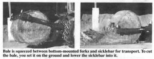 "It does a better job than cutting bales up with a tub grinder because it keeps the leaves intact instead of hammering them to pieces," says Cooksey. "Another problem with tub grinders is that they cut hay into 1-in. long pieces that are too short for dairy rations. Our bale cutter gives you complete control over the length of hay. It also reduces wind loss that occurs from grinding or shredding. It's big enough to handle large 5 1/2 by 6-ft. bales. The hydraulic cylinders that pull the sicklebar down are attached to a cam that's also attached to the bale forks. If you have to cut a dense, wet bale and the sicklebar starts to bind, the bale forks pivot up automatically to release the bale."