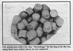 Their main business at this time, however, is selling 2-in. dia. briquettes called Strawloggs. "Many people buy Strawloggs to burn in their fireplaces or furnaces. We sell the briquettes in 40-lb. bags or by the ton. The briquettes are clean, easy to handle, plus they have less pollution than wood. Straw also doesn't have creosote that gums up chimneys and stovepipes," says Strasser.