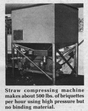 In the machine, bales are shredded, run through a hammermill, then put into a holding tank. From the tank, ground up straw is metered into a press which exerts 52 lbs. pressure per sq. in. to compress the straw. Straw is then extruded as briquettes through a cooling tube.