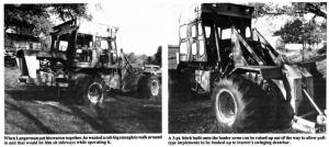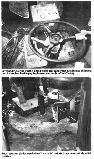 "I built it 15 years ago, but it has many of the same features found on today's 4-WD tractors. I spent only about $20,000 to build it," says Lowell Langerman, Fayette, Iowa. "I wanted a cab big enough that I could stand up and walk around in and also be able to sit sideways in the cab to operate without looking back over my shoulder all the time. To rotate the turntable I simply grab onto something and pull myself around."