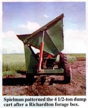Mark Spielman patterned the 4 1/2-ton capacity cart after a Richardton forage box. A local fabricating shop made the box which Spielman mounted on the axle off an old Deere pull-type combine. The hinged box is raised or lowered by a pair of 4-ft. hydraulic cylinders. Spielman stores fertilizer in a shed with a concrete floor. He uses a skid steer loader to load fertilizer into the cart. He uses a pickup to tow the cart to the field. Quick couplers mounted on the cart allow him to use the tractor on the spreader to power the cart.