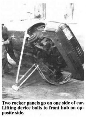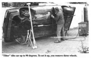 "It's better than an overhead hoist be-cause it lets you work in a comfortable position," says Robert Baker, U.S. distributor of the German-built "tilter". The de-vice consists simply of three parts: Two rocker cradles and a rolling lift mechanism that's powered by a 1/2-in. electric drill. You can use the "tiller" on any level surface and it'll tilt a car up to 90 degrees (it's recommended you go no further than 80 degrees with a pickup because they're more top heavy).