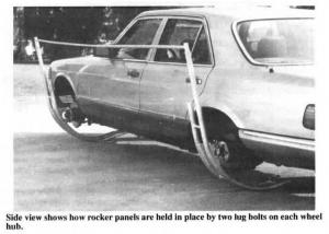 To set it up, you must remove three wheels - front and back on one side and the front wheel on the other side. The two rocker panels go on one side of the car, held in place by two lug bolts on each wheel hub. The lifting device bolts to the front hub on the opposite side. Then you just attach an electric drill and turn it on. The vehicle is raised by lifting of the front hub, which slides upward attached to a bracket on the lift mast. Small neoprene wheels at the base of the lift mast roll outward as the vehicle raises up and the rocker cradles roll back.