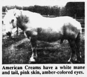 The cream colored draft horse has a white mane and tail, pink skin, and amber-colored eyes. "The white markings contrast beautifully with the rich cream color," note the Sperlaks.