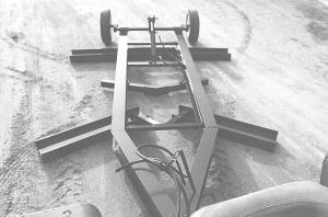 The first set of front blades is angled for-ward to remove material from the edge of the road and push it to the center. The second set of blades is angled to remove material from the center of the road and push it outward. The rear blade is pitched for crowning work.