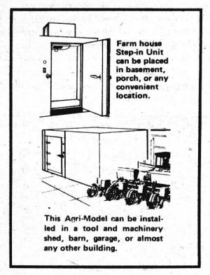 For more than 30 years, this company has been building commercial storage and freezing facilities. They now bring this same quality to farm size cooling-freezing units. They range in size from 5 by 4 by 61/2 ft., to 6 by 7 by 61/2 ft, in step-in models for the farm house. Larger walk-in models range in size from 6 by 6 ft. to 8 by 10 ft. (71/2 ft. high).