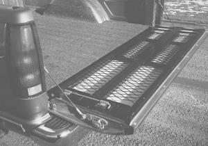 The 9-in. wide ramps come in pairs and have extensions that give them a total length of 6 ft. 4 in. Load limit is 1,000 lbs. A chrome-plated protective bar bolts near the top of the tailgate to provide a lip that holds the ramps securely to the tailgate during loading and unloading. The chrome bar also protects the top edge of the tail-gate and strengthens it. A steel rod inserted through a bracket at each end of the tail-gate secures the ramps and prevents rattling.