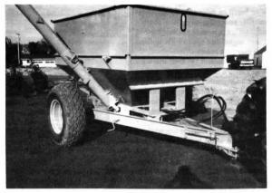 Mark Foldesi, of Greenbush, made several of the auger wagons last fall when wet weather kept farmers in his area from getting into fields with trucks or 4-wheel gravity boxes. He usually equips each 200 to 400 bu. grain box with two augers, one along the bottom and one out the side. Each auger is powered by an orbit motor.