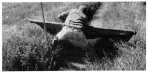 This "better way to make temporary irrigation dams" is a triangular shaped piece of thick, curved polyethylene sheeting rein-forced with plastic stiffeners and a wire strongback. It weighs only 11 lbs., making it easy to handle. One person working alone can install it in seconds in any standard 5 to 7 ft. V-ditch, including full flowing and grassy ditches. The device and tarp are held tightly against the ditch bottom and sides by the pressure of the water.