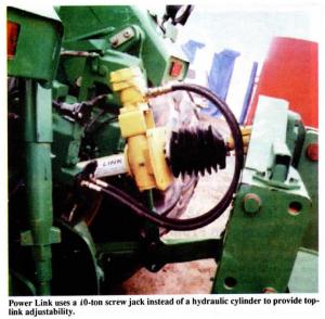 Designed for category H, III and IV tractor and Caterpillar 3-pt. hitches, Power Link uses a 10-ton screw jack instead of a hydraulic cylinder to provide top-link adjustability.