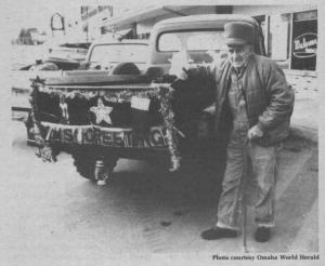 He adorns the red truck's tailgate with plenty of tinsel, a red lantern, a star, a candle and a stocking which friendly neighbors occasionally fill with a few surprises. Timmerman adds tinsel down the side mirror framework and a Santa Claus face on the back of the cab for the finishing holiday touch.