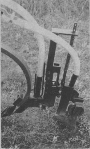 Fertilizer is deep-injected through a knife mounted directly behind the chisel plow shank. Seed is dropped just behind the fertilizer knife through a 12-in. wide sweep. The sweep is mounted on a depth control bar which allows it to float up and down. A small gauge wheel mounted on the sweep maintains proper depth. Seed is planted 3 in. off to either side of the center of the 12-in. wide sweep, through seed tubes built into the bottom of the sweep, resulting in 6-in. spaced rows. Row spacing can be changed by moving the sweeps or plugging up one of the seed tubes on the sweeps.