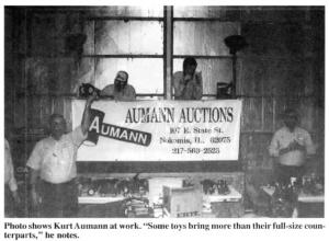 All along Aumann has had a strong interest in toy tractors and, as an auctioneer, he has finally been able to combine his interest in toy collecting with his business of auctioneering. Collectors from all over the country with toy collections to sell contact him. And when he has a sale coming up, he has a national mailing list of collectors which he notifies.