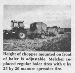 Melcher notes that, if he was doing the job over, he'd mount the chopper further in front of the baler so there's more room for air from the chopper to escape, and so the choppers paddles aren't so close to the pickup teeth. He'd also use a chopper with 6 in. wide paddles, rather than the 2 in. wide paddles which, he says, chop the stalks a little too fine. "I also think the wider paddles would let me increase my ground speed. Right now, I go about 6 mph with my 2-150 White tractor but an 80 hp. tractor would be powerful enough," Melcher told FARM SHOW.