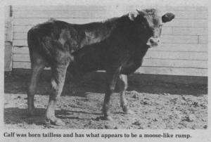 Born to a Jersey cow on the Herb and Jean Gilbert farm near Drayton Valley, Alberta, an area where there are lots of moose, the bull calf doesn't look like any calf that ever came out of a Jersey mother and a bovine sire. The calf was born tailless, like a moose, has the beginning of a significant hump, again similar to a moose, and its hair is the same color and texture as a moose.