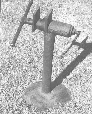 Larry Zenz, Parks, Ark.: "I use this portable vise in the hay fields behind my round baler to splice belts. I made it out of heavy pipe, 7/8-in. threaded rod, steel plate, and a disc blade. The disc blade forms the base. Two pieces of heavy plate steel mount on sections of pipe that fit inside each other. A "T" handle turns the pipe in and out."