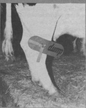 Dump Belt For Dairy Cows DAIRY EQUIPMENT & IDEAS Dairy Equipment & Ideas 8-4-15 LeRoy Bauer is also inventor of the "Dump Belt" for dairy cows that attaches to cow's legs and is an impossible-to-miss reminder to the milker that the cow's milk should be dumped. The plastic leg tie-on has the word "dump" written across it in such a way that the word reads the same right side up or upside down. Bauer sells the belts for $5.90 plus $1 shipping.