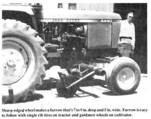 Bernard designed and now manufactures the new system, which uses sharp-edged wheels to make the deep furrows. "I built it because we weren't happy with other systems on the market. Other systems use the weight of 3-pt. mounted implements to dig a furrow. This system uses the weight of the tractor and forms a deep, distinct furrow that'll stand up to heavy rain and irrigation. Guidance systems that use wand-type sensors require lots of electronics and can be thrown off the row if they hit a corn stalk or a dirt clod. This system makes a trench that's hard and distinct. It's the only guidance system that works well in heavy trash. The furrow is easy to follow with single rib tires on the tractor and the guidance wheels on the cultivator. Once you're in the fur-row, you can take your hands off the wheel and forget about steering."