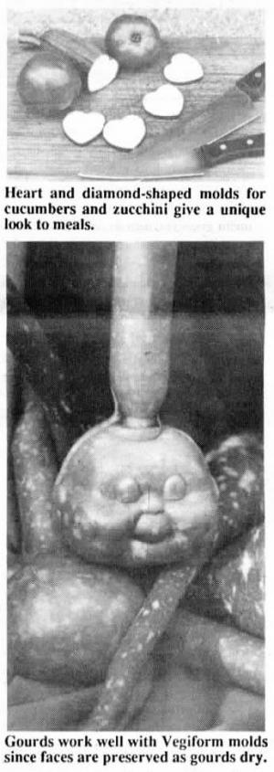 There are five different molds and all sell for $9.95 each. For cucumbers, zucchini and other similar-shaped vegetables there's the "Pickle Puss" face (2 forms included), and the diamond, heart, and corn-on-thecob-shaped molds. The fifth mold is the Garden Elf which is about 6 in. around and is intended for pumpkins, squash, melons, gourds, and other round fruits and vegetables.