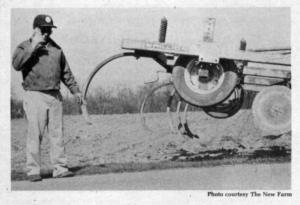In modifying his Brillion chisel plow, Myer removed half the chisels and on the remaining five (spaced 30-in. apart) he replaced the chisel shovels with 2-in. wide, 10-in. long teeth. He also added heavy-duty coulters in front of each of the rows to cut through trash.