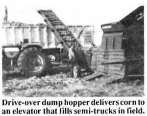 The Millers dump corn from the "combine husker" into six 14-ft. long hydraulic-hoist dump wagons which they built from junked-out self-unload forage wagons. The wagons rear-unload corn into a home-built drive-over dump hopper that delivers corn to a 30-in. wide elevator that fills semi-trucks in the field. The elevator, drive-over dump, and hydraulic-hoist wagons are all operated by the tractor which the Millers use to move the system from field to field.