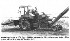 Old Combine Works Great As Corn Picker COMBINES Conversions 14-1-25 Old combines make great corn pickers, say Floyd Miller and sons Conrad and Elwood, White Pigeon, Mich., who built an inexpensive "combine picker" by removing the threshing system from a 1970 Deere 6600 6-row combine and replacing it with a New Idea 837 husking bed.
