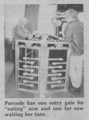 One feed station and large feed computer will handle right at 50 sows. The combination sells for right at $6,000, or about $120 per sow. However, the computer is large enough for three feeding stations and upwards of 150 total sows. Additional feeding stations are $2,500 each. "On a per sow basis for 100 or more sows, the Porcode system with computer is cost competitive with individual stalls or tethers. Plus, you get advantages conventional stalls don't offer", Anderson points out. "Here, sows are free to move and thus have fewer foot and bone problems.. Feeding is automatic and labor free, and there's very little building cost in adapting the Porcode to existing facilities."
