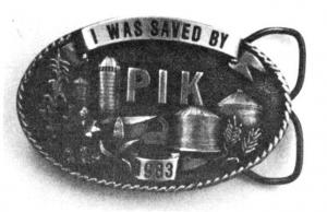 Made with a pewter finish, the limited edition buckle carries the message "I was saved by PIK, 1983" on the front side and, in small print on the back side, the following message: "1983 was the year of PIK (payment in kind program). It was the most costly farm program in history. Farmers were paid with commodities for taking land out of production. Commodities taken out of production were corn, sorghum, wheat, barley, cotton and rice."