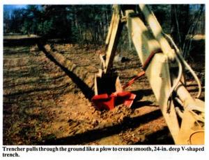 It creates a smooth, 24-in. deep V-shaped trench at a rate or 50 to 100 ft. per minute or more, depending on soil conditions. It pulls through the ground like a plow with soil flowing up to either side.