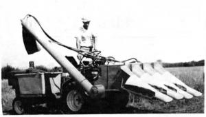 The grain-stripping augers are covered by cone-shaped housings. In operation, the augers are postioned about half way up the stalks. The stalks are drawn into the auger housing, and grain is stripped off and augered up into the machine and loaded into a trailing hopper.