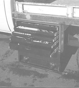 It mounts under pickup, truck or trailer beds and comes in two or five-drawer models. Features a weather tight door that wraps around three sides and hinges on bottom. The edge of the door fits inside a pocket formed by angle iron welded to the edge of the toolbox. The edge of the door is weather stripped and it latches with T-handle that tightens until a weather-proof seal forms.