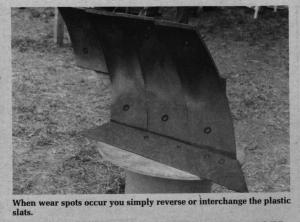 A complete set includes three slatsthat run vertically down to the steel plow share at the bottom, which is left in place. The fourth piece, at rear, is simply reversible. All plastic slats are ¢ in. thick and of the same material that is now being used by companies to build car engines and other high wear parts.