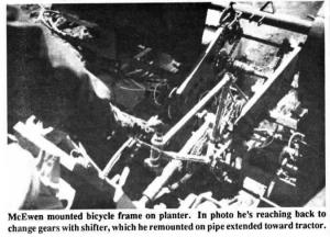 McEwen cut the right pedal off the bicycle, leaving the two drive sprockets intact. He removed the left pedal and mounted a sprocket in its place. Two countershafts were necessary - one on front of the toolbar and one under the tractor axle which acts as a hinge for the small wheel assembly as well as being part of the powertrain. A small rubber tire runs inside the rim of the tractor's real wheel. A spring on the 3-pt. hitch pulls the small rubber wheel against the rim. Raising the 3-pt. hitch and cultivator disengages the fertilizer drive. He dismantled the rear bicycle wheel and discarded the rim and spokes, then welded a sprocket to the original axle. A chain leads from the sprocket to the planter's original countershaft. All of the original speed options are still available as well as the 10-speed on-the-go speed changes. All bicycle sprocket ratios were calculated for exact fertilizer ratios.