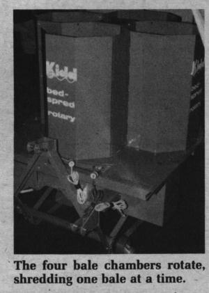 The 3-pt. mounted, pto-powered chopper saves time by carrying 4 bales at once. Each of its four chambers holds one conventional rectangular bale. When one bale is chopped, you rotate the chamber so the next bale is shredded. You can shred all 4 bales without leaving the tractor seat.