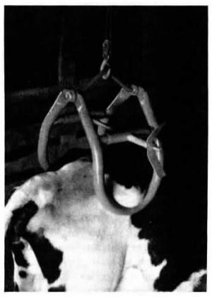 The "Hip Hugger" can be raised by a block and tackle mounted on the barn roof or by a chain attached to a front-end loader. As it's raised the Hip Hugger's two sides come together with a scissors-type action that tightly grips the cow, yet is easy on her. A large wing nut can be adjusted to get the proper grip.