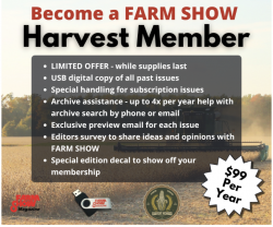 Become a FARM SHOW Harvest Member! For only $99, your subscription will include a USB digital copy of all past issues, special handling for mailed issues, archive assistance - up to 4x per year help with archive search by phone or email, exclusive preview email for each issue, editors survey to share ideas and opinions with FARM SHOW, and a special edition decal to show off your membership! Limited offer, while supplies last.