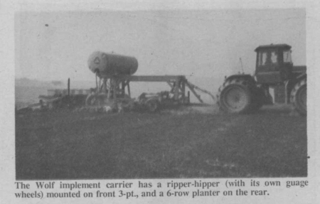 The Wolfs and Carpenter each used their implement carriers last year and again this year to plant about 1,000 acres of corn and soybeans. "It really works great and is a tremendous cost-saver," says Carpenter. "I used to make as many as seven trips over the field to prepare the seedbed and plant the crop. With this new rig, I do it all in one pass. What's more, I use the same 3 pt. tillage and planting equipment I was using before so my only investment was in the custom-built carrier. I can use it as double assist for combination tilling and planting, or it can be used as a single assist for special tillage or other operations. The carrier is extremely versatile and could be used with row crop equipment up to 12 rows, and with 3 pt. or pull type cultivators and drills for once-over planting of small grain and other crops."