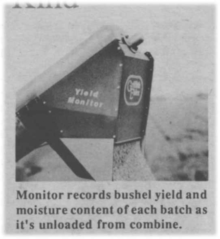Designed to fit all combines, the new moisture-yield monitor mounts on the outer end of the unloading auger. As grain is unloaded, whether standing still or on the go, the device monitors both yield and moisture content. "There are no moving parts so grain is free to run out the spout at the maximum unloading rate," says Elder. He notes that the monitor works on all crops, and records true weight so there is no need to recalibrate for different crops. Moisture content, batch yield and cumulative yield are all displayed on a "Master Monitor" control mounted inside the cab.