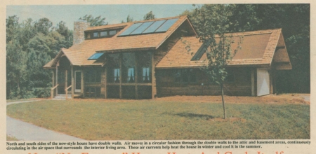 The key feature of the new-style house is the "envelope" construction of the north and south walls which are double-layered with an air space between. Heated air flows freely in a circular motion through the walls, ceiling and basement, radiating into the house through interior walls.