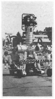 "Partsman" is powered by a 6-hp Briggs & Stratton engine that drives a Model A Ford transmission and a Chevy Vega drive axle. There are seats for 4 passengers on the robot and a seat at center for the driver. "I spent very little to built it," says Keller.