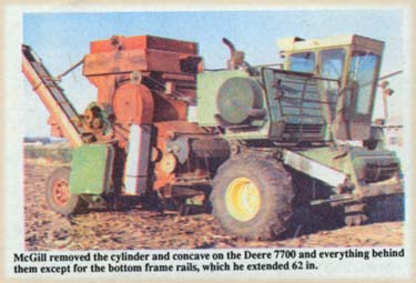McGill says he was dissatisfied with his Uni-Harvester for several reasons. "Maintenance and repairs are difficult to make and required too often. The cab is awkward to use. Weight distribution is poor because the power unit is on one side and the much lighter husking bed on the other side, and the rear end is too light for effective 4-WD. Trash build-up makes the engine susceptible to fife, and the rigid hitch makes wagon hook-up difficult.