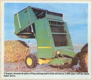 At this time the chopper fits Deere's 530 round baler but the company plans to fit other makes and models in the near future. The chopper is the width of the bale chamber, wide enough to chop two rows of cornstalks at a time. Gravel says the chopper works best on standing stalks since it works down to within 2 in. of the ground. Farmers who've used the unit chopped the rows of stalks left standing by the combine and skipped the rows that were flattened. He says many farmers want to be able to pick up down stalks, however, so the company is experimenting with different shaped flails that would create more vacuum, sucking stalks up into the machine.