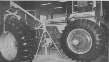 The swing-away lift arm is mounted on a pedestal that consists of two brace arms and a drive-on stand. Any 3-ton hydraulic hand jack can be inserted under the lift arm. A pair of scissoring tongs, each side fitted with a pair of bearings mounted at right angles to each other, lift the wheel to swing it over to tractor. Bearings on tongs allow full wheel rotation to line up bolt holes.