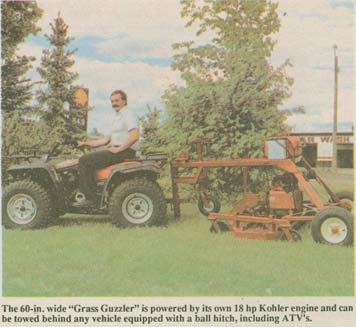 "I built it because I wanted a mower that was inexpensive to maintain and easy to tow. I liked it so much I decided to manufacture units for sale," says Eugene Keyowski, who farms and also owns a rental business. "I had been renting out a riding lawn mower that was constantly breaking down. I wasn't making any money renting it out because I had to spend so much money on repairs. My mower is practically maintenance-free. One person can hitch it up and tow it behind any vehicle equipped with a ball hitch. You raise the deck up with a winch for transport. Mowing height is controlled by repositioning pins on both sides of the deck.