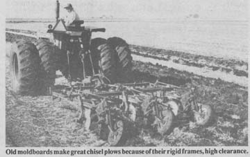 Bob Elder, who farms near Chenoa, says old moldboards make great chisel plows because of their rigid frames and high clearance. He mounted three IHC 3-bottom plows side by side, bolting them together into a single frame. Then he used his cutting torch to cut away the moldboards, leaving narrow chisel points. He mounted a hydraulic lift cylinder up front to raise and lower the front end of the trailing machine and left the three rear wheels in place. One draw-back is, "I have to crank the rear wheels up and down for road travel," says Elder. The plow retains the spring-loaded hitch that permits the plow to detach if he hits some-thing solid.