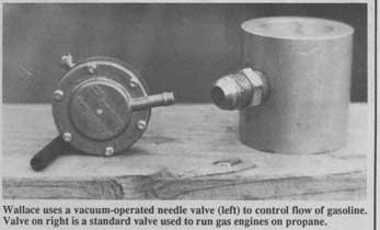 "I connected a vacuum-operated valve, equipped with a needle valve to control flow of gasoline, to the venturi vacuum of the distributor. Now the engine idles on 100 percent propane and burns propane with a trickle of gasoline when I accelerate and vacuum opens up the gasoline control valve.