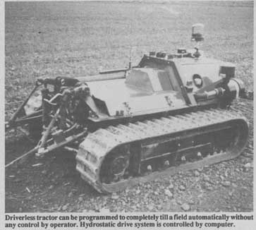 He explains that the tractor -- which will be available with either tracks or wheels -- can be programmed to completely till a field automatically without any control by an operator. It's powered by a 6-cyl. Kubota engine with a maximum speed of about 8 mph (the wheeled version is powered by a Perkins diesel and has a maximum speed of 24 mph). Features front and rear 3-pt. and pto and a hydrostatic drive system that's controlled by a computer module. Navigational aids are set up around the field to be worked -- something like a laser-guided terracing or tiling machine -- and the tractor is programmed to work the field.
