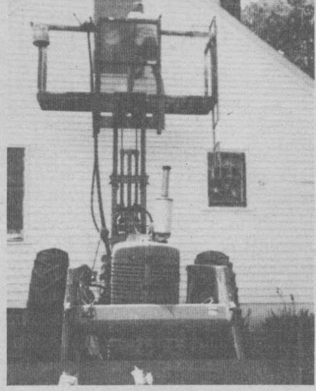 "I put a forklift mast on the rear of my Farmall M and attached a 2 by 8-ft. platform to the forks. It works great for painting farm buildings, roofing, repairing overhead doors, erecting buildings, and doing many other jobs. It's the best labor-saver on my farm," says Larry Gangnes, Argusville, N. Dak.