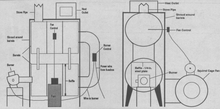 It consists of two 45-gal. barrels mounted one on top of the other. The barrels are surrounded by a sheet metal housing that captures heat thrown off by the barrels. A squirrel cage fan, off an old furnace, blows air into the housing around the barrels. Hot air comes out an outlet at the top of the housing and blows into the room.