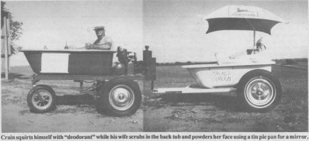 "I tried to rig up a bubble machine to blow bubbles out of the tubs but never got that working right so I settled for a little yellow rubber duck that's mounted on a coil spring so he looks like he's swimming when we're moving. The squirt can in my right hand in the photo holds my "deodorant". After I scrub good under the arms, I give myself a couple of squirts. My wife scrubs in the back tub and powders her face using a tin pie pan for a mirror.